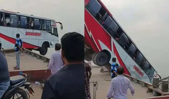 ফেরিতে ওঠার সময় যাত্রীবাহী বাস উল্টে নদীতে, হতাহতের শঙ্কা