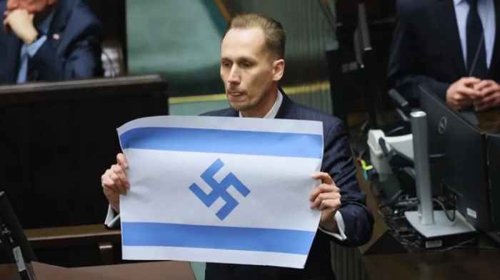 উল্লেখ্য, পোল্যান্ডের আইন অনুযায়ী জনসমক্ষে নাৎসি প্রতীক ব্যবহার করা এবং বিদেশি রাষ্ট্রের পতাকাকে ছোট করা শাস্তিযোগ্য অপরাধ। পার্লামেন্টের অন্যান্য সদস্যরাও এই ঘটনাকে লজ্জাজনক বলে অভিহিত করেছেন এবং দাবি করেছেন, রাজনৈতিক মতপার্থক্য থাকলেও এমন ঘৃণ্য পথ বেছে নেওয়া কোনোভাবেই গ্রহণযোগ্য নয়।