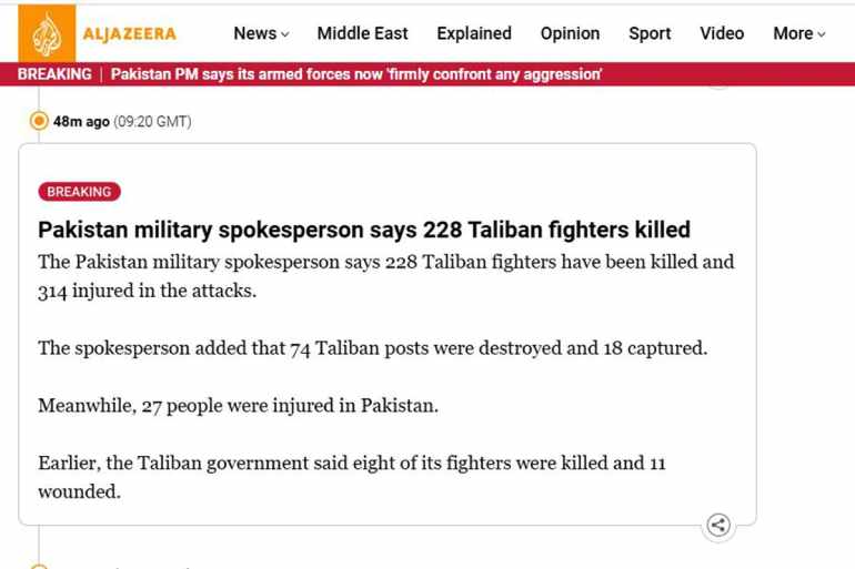 পাকিস্তান সামরিক বাহিনীর ওই মুখপাত্র আরও বলেন, পাকিস্তানের হামলায় অন্তত ৩১৪ জন তালেবান যোদ্ধা আহত হয়েছেন। এছাড়া তালেবানের ৭৪টি সামরিক চৌকি পুরোপুরি ধ্বংস এবং ১৮টি চৌকি পাকিস্তান সেনাবাহিনী দখলে নিয়েছে।