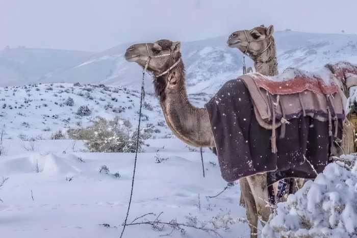 আকাশের মেঘ চিরে যখন ঝুরঝুরে বরফ পাহাড়ের বন্ধুর ঢালে জমার সেই দৃশ্য দেখতে হুমড়ি খেয়ে পড়ছে পর্যটক আর স্থানীয় বাসিন্দারা। ত্রোজেনার হিমশীতল উচ্চতায় কেউ মেতে উঠলেন স্কিইংয়ের নেশায়, কেউ বা পরম বিস্ময়ে লেন্সবন্দি করলেন বালু আর বরফের এই মিতালি। সামাজিক যোগাযোগ মাধ্যমে ভাইরাল হওয়া একটি ভিডিওতে দেখা গেছে, মাথার ওপর ঘন কালো মেঘের আনাগোনা আর নিচে দিগন্তজোড়া সাদা বরফের ওপর দিয়ে ধীরলয়ে হেঁটে যাচ্ছে উটের দল, মরুভূমির এই রুদ্র-সুন্দর রূপ যেন কোনো এক স্বপ্নীল ক্যানভাস।