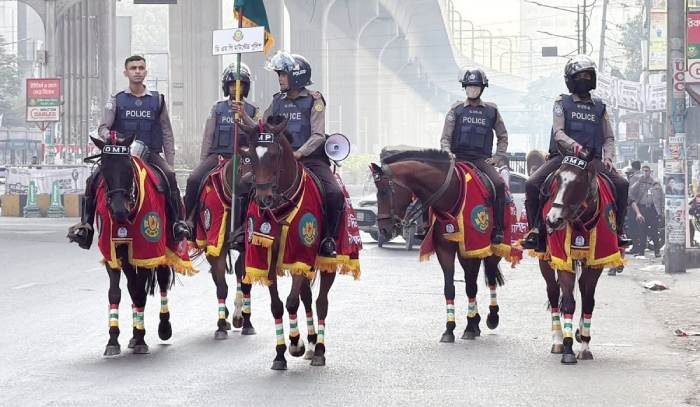 ডিএমপির ভিন্ন উদ্যোগ: ভোটে উৎসবের আমেজ দিতে ঘোড়ায় চড়ে পুলিশের নিরাপত্তার বার্তা
