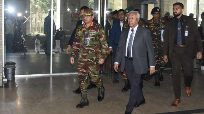 রোববার (২১ ডিসেম্বর) দুপুর ১২টার দিকে নির্বাচন ভবনে আসেন সেনাবাহিনী প্রধান জেনারেল ওয়াকার-উজ-জামান, নৌবাহিনী প্রধান অ্যাডমিরাল মোহাম্মদ নাজমুল হাসান ও বিমান বাহিনী প্রধান এয়ার চিফ মার্শাল হাসান মাহমুদ খান।