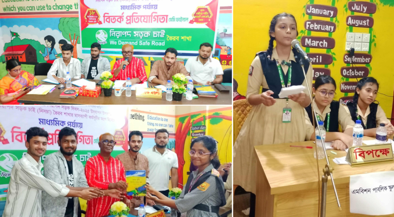 নিজস্ব প্রতিবেদক: “মানসম্মত হেলমেট ও নিরাপদ গতি, কমবে জীবন ও সম্পদের ক্ষতি”— এই প্রতিপাদ্যকে সামনে রেখে আসন্ন ২২ অক্টোবর জাতীয় নিরাপদ সড়ক দিবস উপলক্ষে নিরাপদ সড়ক চাই (নিসচা) ভৈরব শাখা মাসব্যাপী নানা কর্মসূচি গ্রহণ করেছে। এই কর্মসূচির অংশ হিসেবে আজ ১৮ অক্টোবর ২০২৫ (শনিবার) বিকেল ৩•৩০ মিনিটে গাজীপুর শাহীন ক্যাডেট একাডেমি, ভৈরব শাখার প্রাঙ্গণে মাধ্যমিক পর্যায়ের বিতর্ক প্রতিযোগিতা সেমিফাইনাল অনুষ্ঠিত হয়েছে।