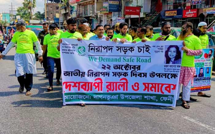 মোঃ মোস্তাফিজুর রহমান সোহেল: নিরাপদ সড়ক চাই দাগনভূঞা উপজেলা শাখার আয়োজনে “মানসম্মত হেলমেট ও নিরাপদ গতি, কমবে জীবন ও সম্পদের ক্ষতি, আইন মেনে সড়কে চলি নিরাপদে বাড়ি ফিরি, পথ যেন হয় শান্তির মৃত্যুর নয়, এ প্রতিপাদ্য কে সামনে রেখে জাতীয় নিরাপদ সড়ক দিবস উদযাপন উপলক্ষে দাগনভূঞা শাখা বর্ণাঢ্য র্যালি ও সমাবেশের আয়োজন করে।