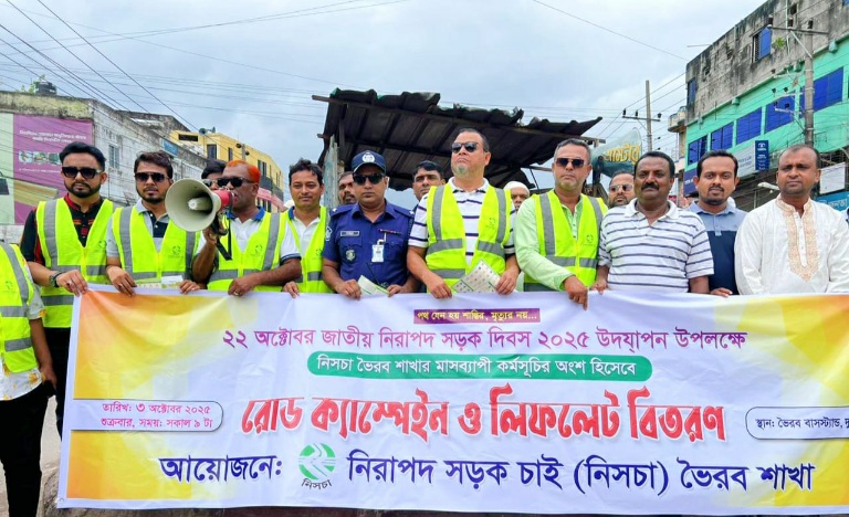 ভৈরব প্রতিনিধি:“ পথ যেন হয় শান্তির, মৃত্যুর নয়”—এই স্লোগানকে ধারণ করে আজ শুক্রবার ০৩ অক্টোবর ২০২৫ সকালে ঢাকা সিলেট ও ভৈরব ময়মনসিংহ সড়কের ভৈরব প্রান্তর ভৈরব বাসস্ট্যান্ড দুর্জয় চত্বরে অনুষ্ঠিত হয়েছে নিরাপদ সড়ক চাই (নিসচা) ভৈরব শাখার রোড ক্যাম্পেইন ও লিফলেট বিতরণ কর্মসূচি। ২২ অক্টোবর জাতীয় নিরাপদ সড়ক দিবস ২০২৫ উদযাপন উপলক্ষে মাসব্যাপী কর্মসূচির অংশ হিসেবে আয়োজিত এ কর্মসূচিতে যাত্রী, চালক ও পথচারীদের মাঝে সচেতনতামূলক লিফলেট বিতরণ করা হয়।