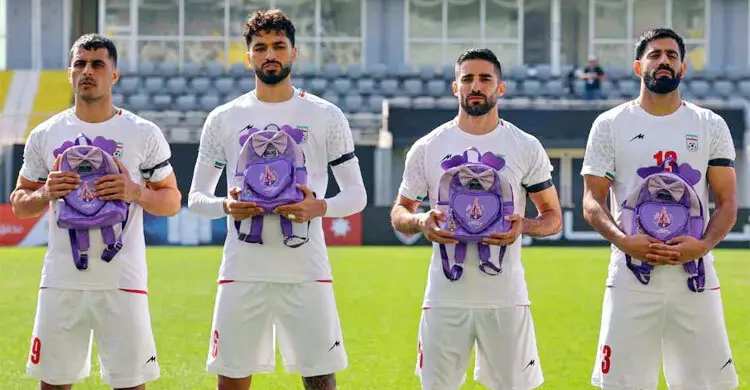 শুক্রবারের ম্যাচে জাতীয় সঙ্গীত চলাকালে ইরানি খেলোয়াড়রা নিজেদের হাতে গোলাপি ও বেগুনি রঙের ছোট স্কুলব্যাগ হাতে দাঁড়ান- যা নিহত শিশুদের স্মৃতির প্রতীক হিসেবে ব্যবহৃত হয়। একই সঙ্গে খেলোয়াড়দের হাতে ছিল কালো আর্মব্যান্ড, যা চলমান সংঘাতে নিহতদের প্রতি শোক প্রকাশের আরেকটি প্রতীক।