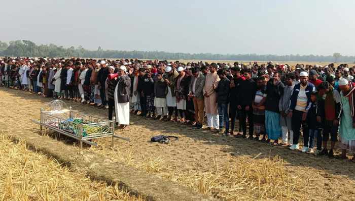 জানাজার মাঠে মানুষের ঢল নামে সকালেই। গ্রামের বৃদ্ধ থেকে শুরু করে স্কুলপড়ুয়া ছেলেরা সবার চোখ ভিজে। কারও কণ্ঠে ফিসফিস—